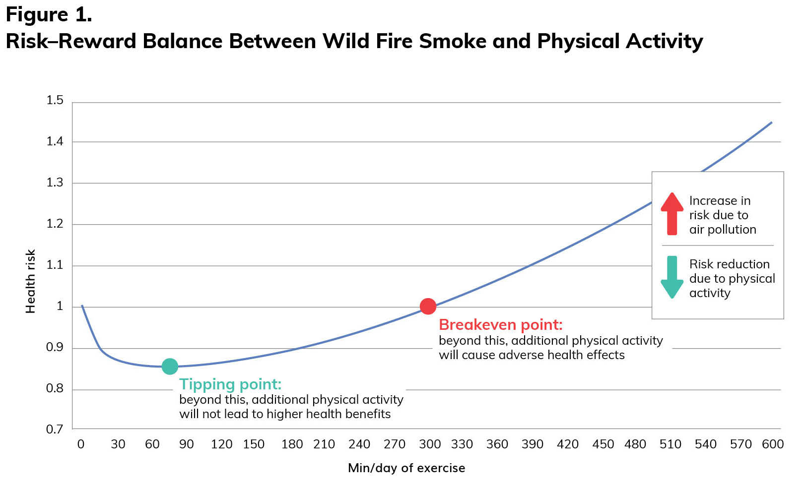 As highlighted earlier, exposure to wildfire smoke can lead to both unfavorable physiological responses and potentially long-term risks. Given that regular physical activity confers numerous health benefits, is there a point at which the risk of exercising in wildfire smoke outweighs the benefits of physical activity for our clients? Research has addressed this question and shown that modest daily doses of lifetime exercise optimize health benefits. It is only at higher daily durations of exercise that there is an increased health risk due to wildfire smoke. It is important to note that these higher volumes of daily physical activity are unlikely to be exceeded except in athletic populations. Figure 1 provides a visual representation of the risk-reward balance between air pollution and physical activity. Exercising indoors should be viewed as a practical option for both clients and exercise professionals when outdoor training isn’t appropriate because the risks outweigh the benefits. Research also suggests that wildfire smoke exposure can impair exercise performance and hinder recovery.
