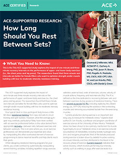 This ACE-supported study explores the impact of one-minute and three-minute recovery intervals on the performance of upper- and lower-body exercises (i.e., the chest press and leg press). The researchers found that three-minute rest intervals are better for female lifters who want to optimize strength and/or muscle building with low-to-moderate intensity resistance training.
