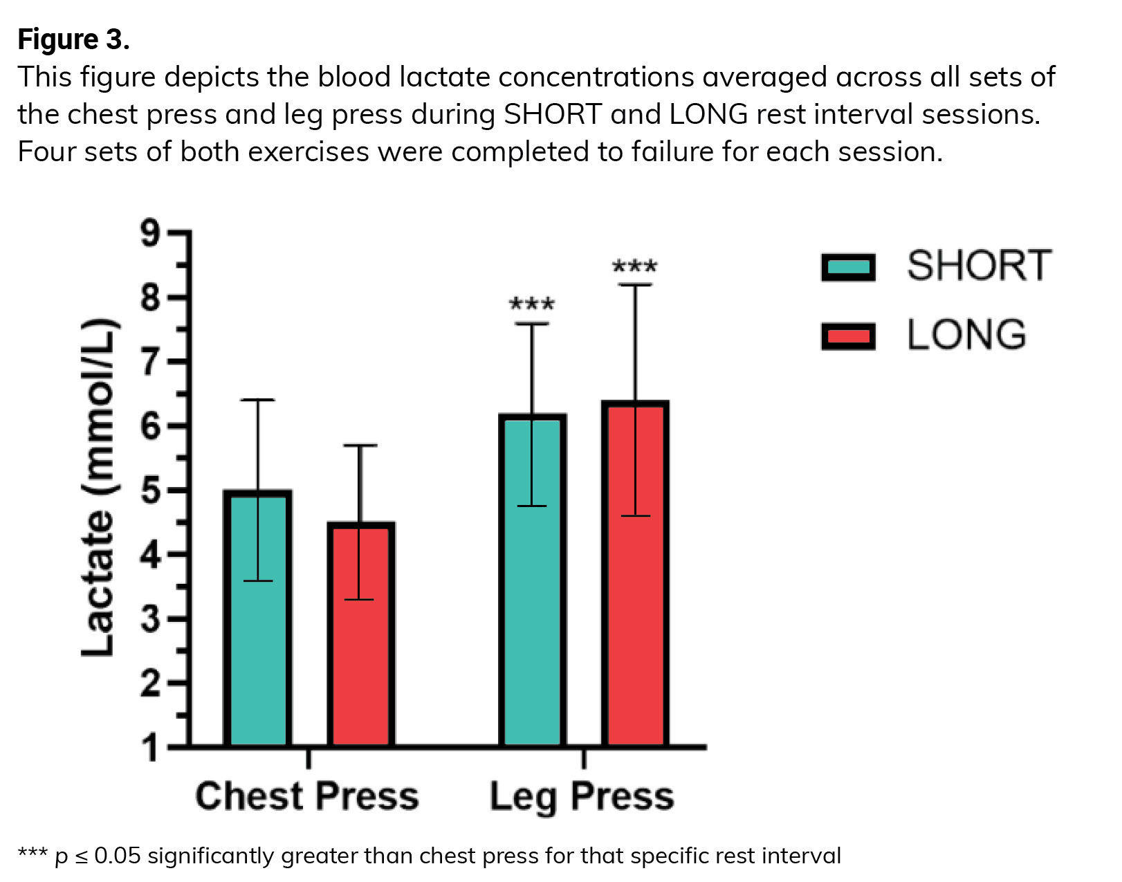 There was no significant difference in lactate production in the SHORT and LONG RIs for either the chest press or the leg press exercise (Figure 3).