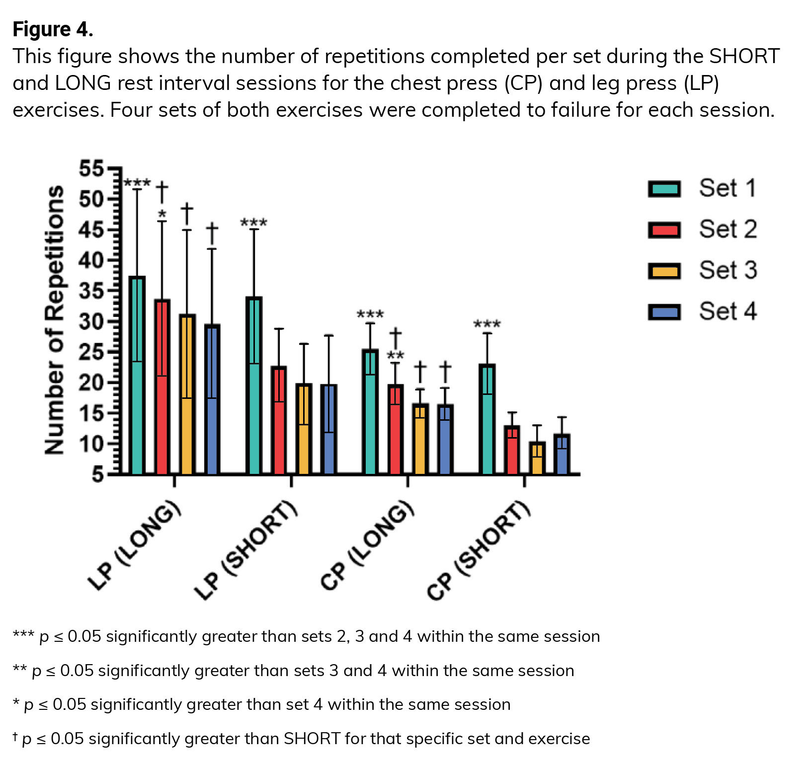 The main finding of this study is that the total volume lifted (the product of Sets x Repetitions x Load) for the SHORT RI session was significantly less than that seen in the LONG RI session for both exercises (Figure 1).
