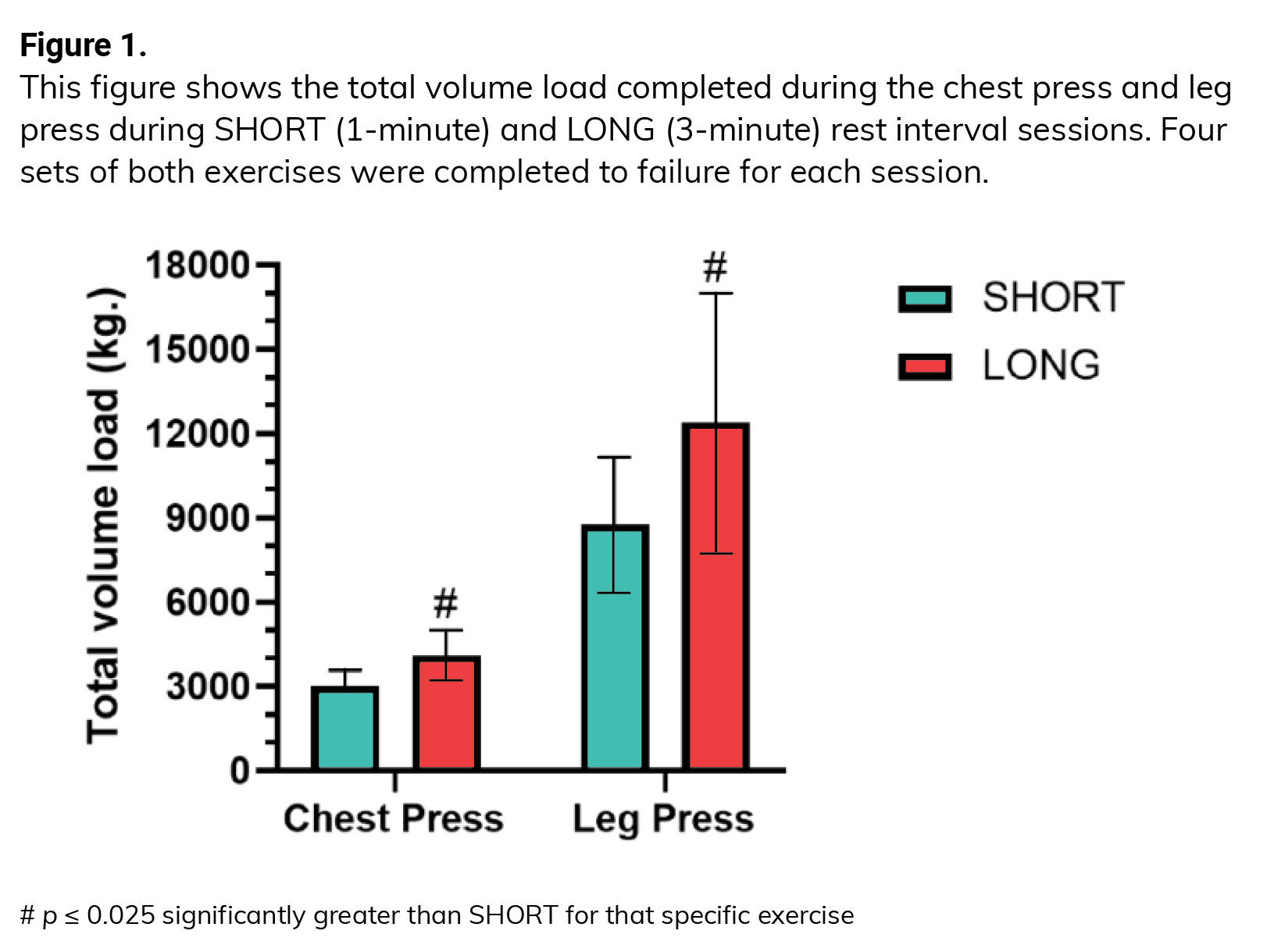 The main finding of this study is that the total volume lifted (the product of Sets x Repetitions x Load) for the SHORT RI session was significantly less than that seen in the LONG RI session for both exercises (Figure 1).