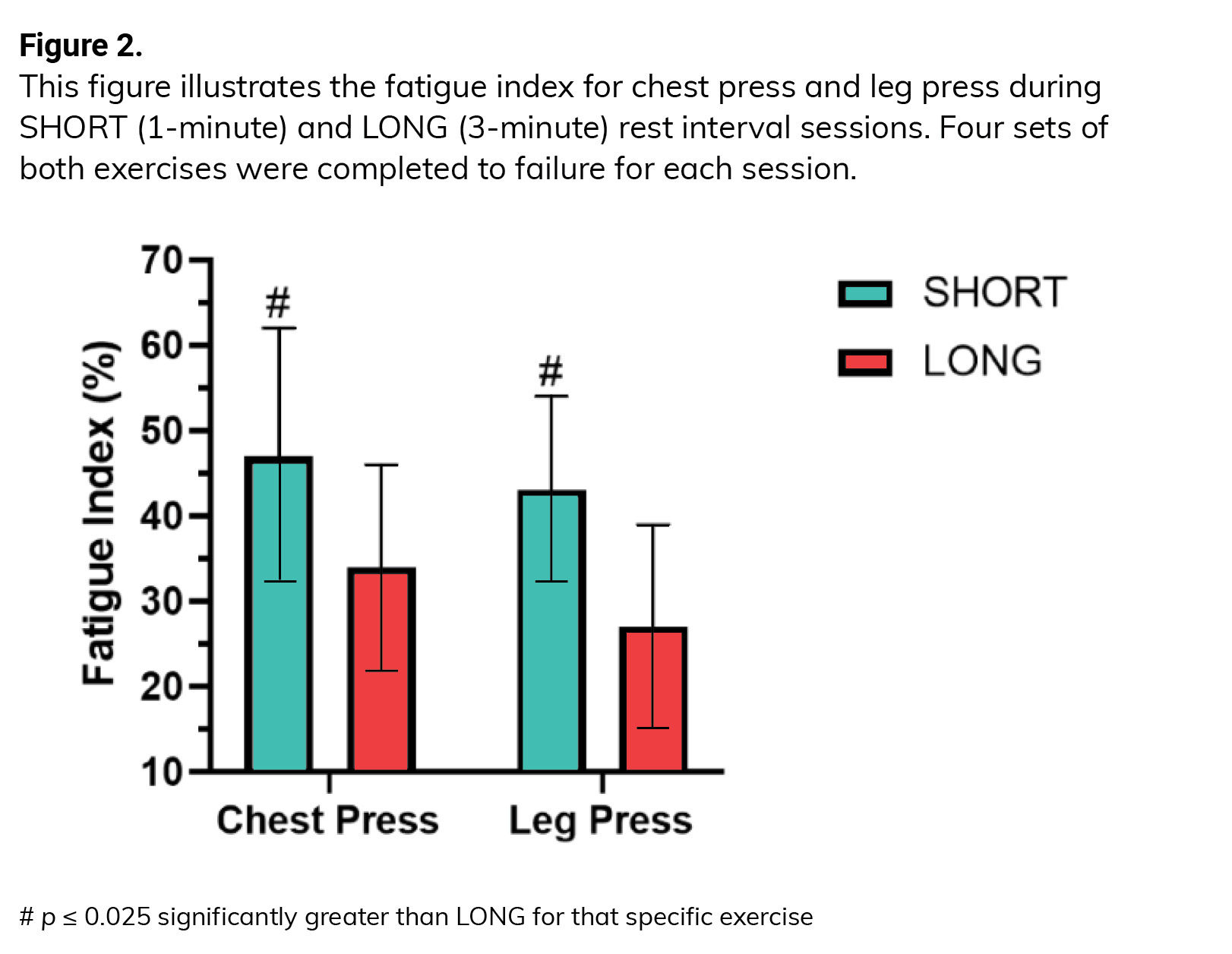 Fatigue, as measured by the fatigue index (calculated by subtracting the repetition number in the fourth set from the repetition number in the first set and dividing by the repetition number in the first set) was greater in the SHORT RI session than in the LONG RI session for both exercises (Figure 2).